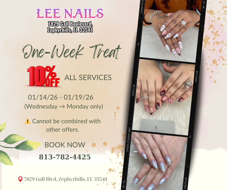 LEE NAILS is located conveniently in Zephyrhills, Florida 33541. Our priorities are client-focused services, high-quality products, and above all else, grade-A sanitation standards.
